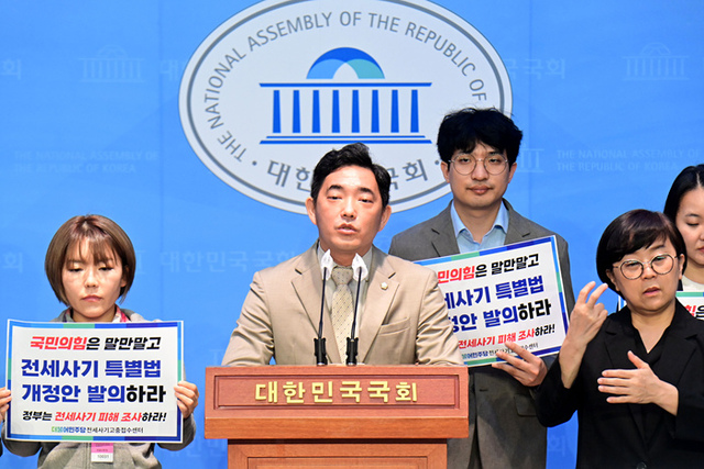 더불어민주당 을지키는민생실천위원회와 전세사기 피해고충 접수센터, 전국청년지방의원협의회가 3일 오후 국회 소통관에서 '전세사기 피해구제조례 전국 동시발의 및 특별법 개정의견' 관련 기자회견을 하고 있다.