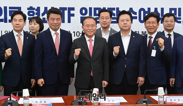 윤재옥 국민의힘 원내대표가 6일 국회에서 열린 지역 필수의료 혁신 태스크포스 1차 회의에서 위원들과 기념촬영을 하고 있다.