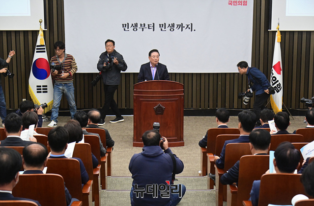 우동기 국민의힘 지방시대위원장이 6일 오후 국회에서 열린 의원총회에서 강연하고 있다.