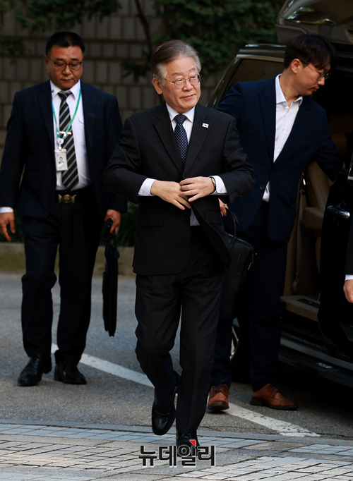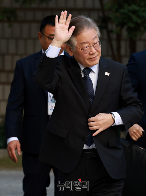 이재명 더불어민주당 대표가 7일 오전 서울 서초구 서울중앙지법에서 열린 '대장동 배임·성남FC 뇌물' 관련 공판에 출석하며 지지자들에게 손을 들어보이고 있다.