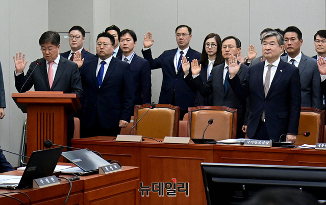 김대기 대통령비서실장, 조태용 국가안보실장, 김종철 대통령경호처 차장 등이 7일 오전 국회에서 열린 국회운영위원회의 대통령비서실 등에 대한 국정감사에서 증인선서를 하고 있다.