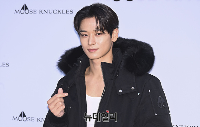 더보이즈 주연이 7일 오후 서울 양천구 현대백화점 목동점에서 열린 무스너클 포토콜 행사에서 포즈를 취하고 있다.