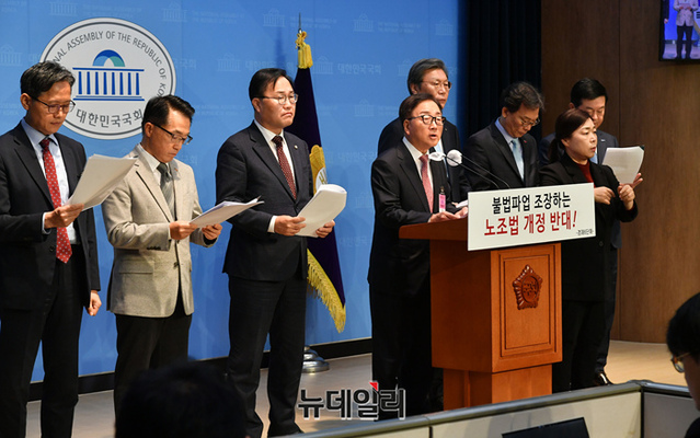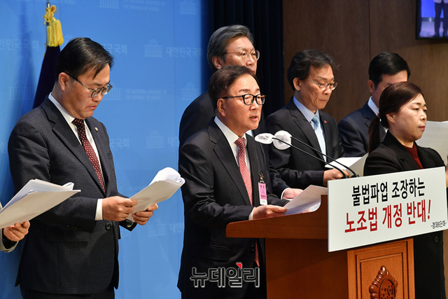 이동근 한국경영자총협회 상근부회장을 및 경제6단체 임원들이 8일 국회 소통관에서 노동조합법 개정안 입법 중단 촉구 공동성명을 발표를 하고 있다. 이날 기자회견에는 홍석준 국민의힘 의원, 이동근 상근부회장, 강석구 대한상공회의소 조사본부장, 김고현 한국무역협회 전무, 김창범 한국경제인협회 상근부회장, 이명로 중소기업중앙회 상무이사, 이호준 한국중견기업연합회 상근부회장이 참석했다.