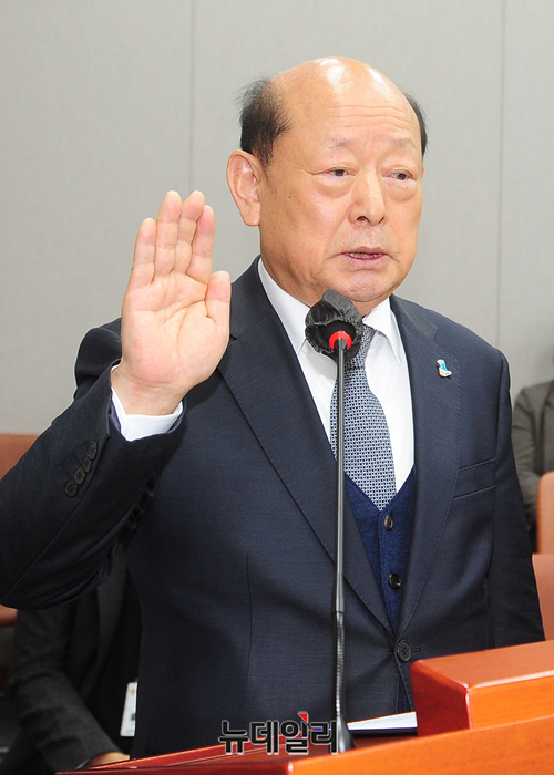 송두환 국가인권위원장이 8일 오전 국회에서 열린 국회운영위 국정감사에서 증인 선서를 하고 있다.