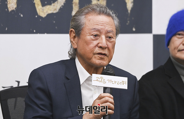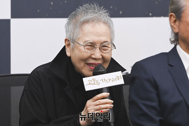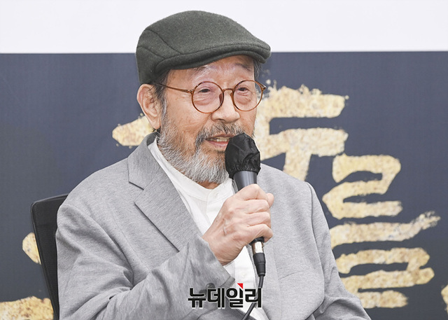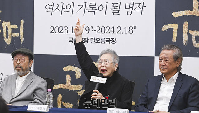오경택 감독, 배우 신구, 박정자, 박근형, 김학철, 김리안이 9일 오전 서울 종로구 예술가의집에서 열린 연극 '고도를 기다리며(연출 오경택)' 기자간담회에서 취재진의 질문에 답하고 있다.