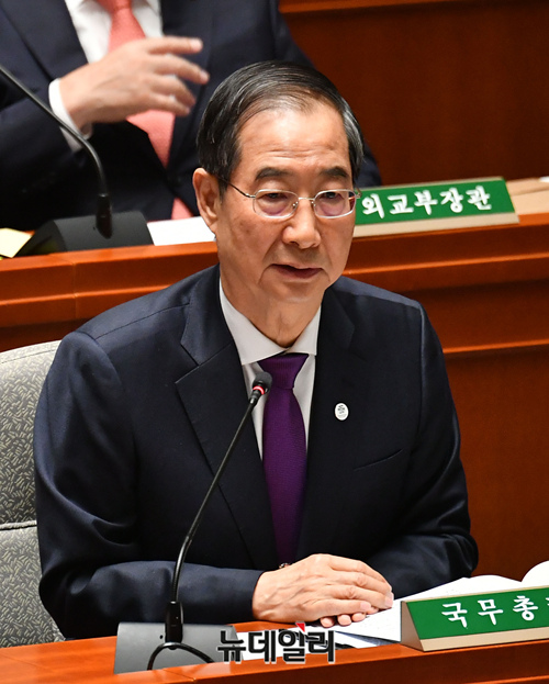 한덕수 국무총리가 9일 국회에서 열린 예산결산특별위원회 전체회의에서 의원들의 질문에 답하고 있다.