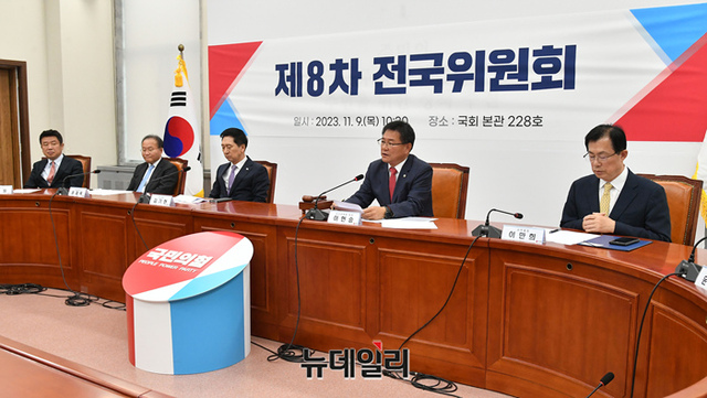 이헌승 국민의힘 전국위원회 의장이 9일 국회에서 열린 제8차 전국위원회에서 발언을 하고 있다.