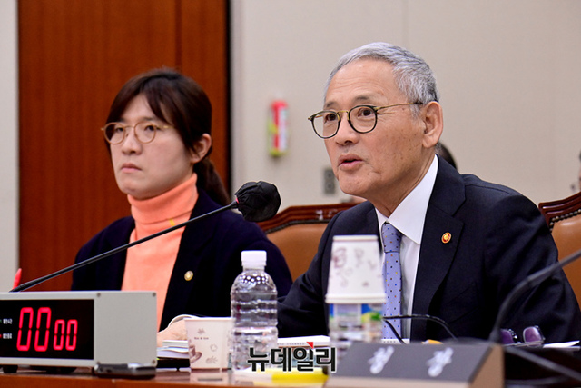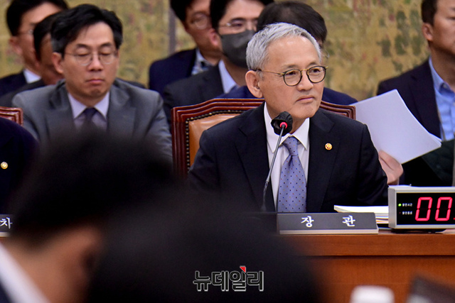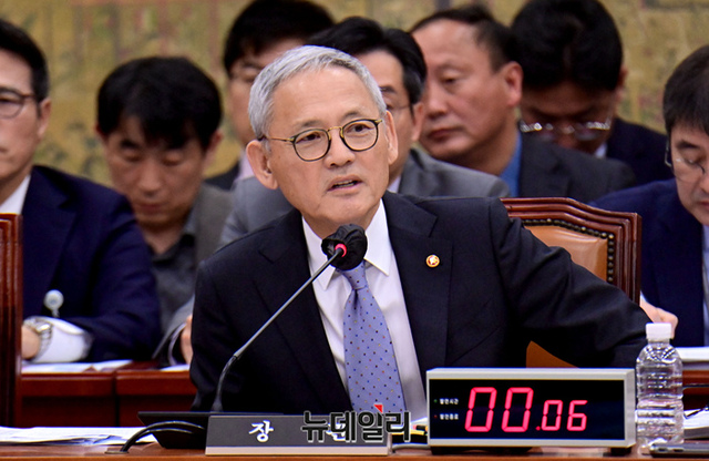 유인촌 문화체육관광부 장관이 9일 국회 문화체육관광위원회 전체회의에서 답하고 있다.