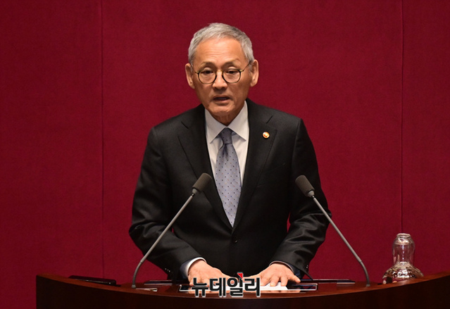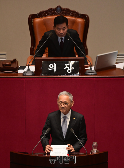 유인촌 문화체육관광부 장관이 9일 국회에서 열린 본희의에서 신임 국무위원 인사를 하고 있다.