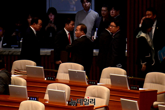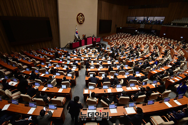 국민의힘 의원들이 9일 국회에서 열린 본회의에서 노란봉투법과 방송3법 표결을 앞두고 회의장을 나가고 있다.