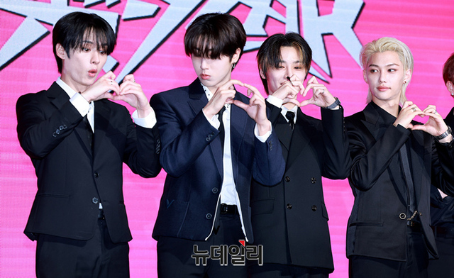 스트레이키즈가 10일 오전 서울 여의도 콘래드 호텔에서 열린 새 미니앨범 '樂-STAR(락스타)' 쇼케이스에서 포토타임을 갖고 있다.