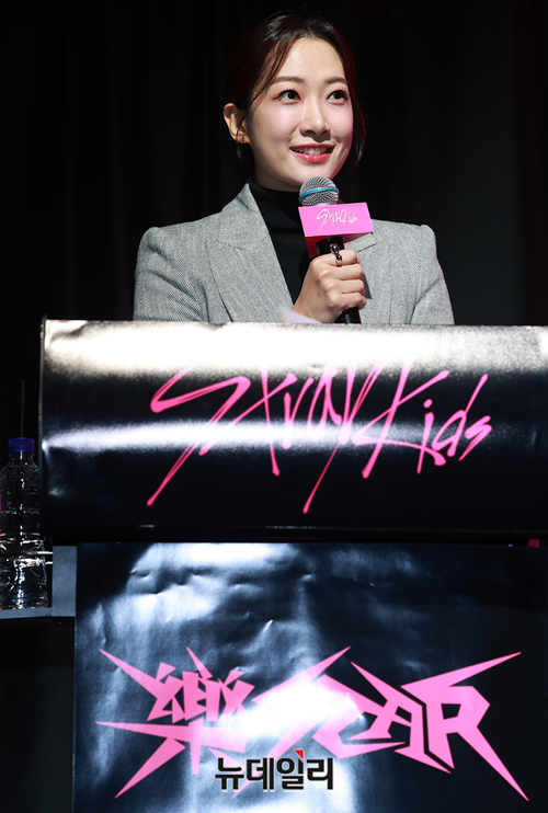 김민정 아나운서가 10일 오전 서울 여의도 콘래드 호텔에서 열린 스트레이키즈 새 미니앨범 '樂-STAR(락스타)' 쇼케이스에서 멤버를 소개하고 있다.