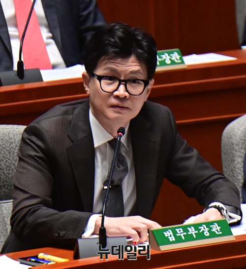 한동훈 법무부 장관이 10일 오전 국회에서 열린 예산결산특별위원회 전체회의에서 의원들의 질문에 답하고 있다.