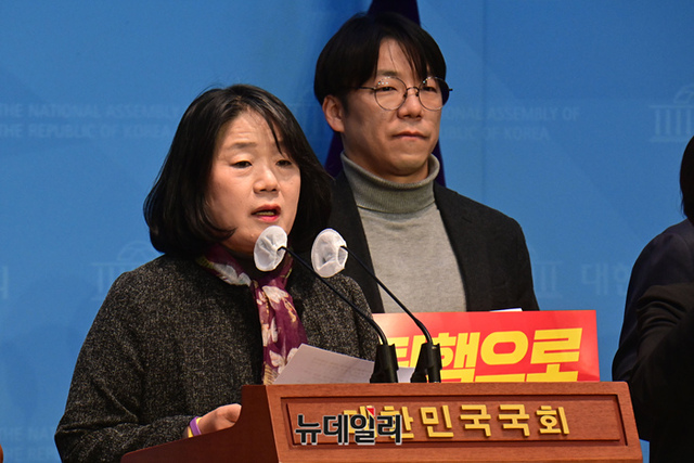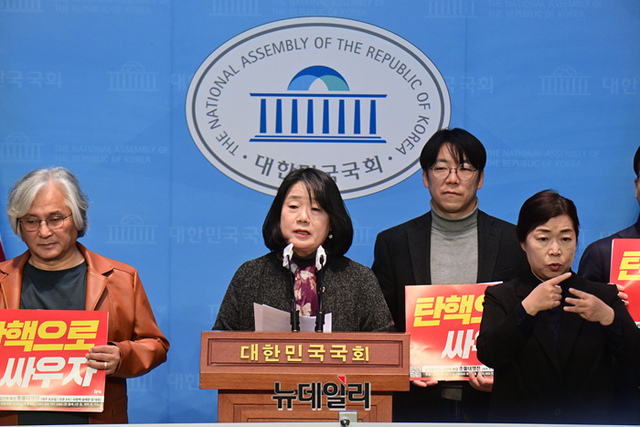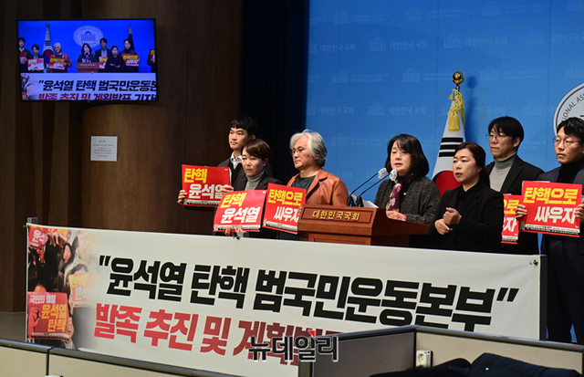 윤미향 무소속 의원이 10일 국회 소통관에서 열린 '윤석열 탄핵 범국민운동본부 발족' 기자회견에서 발언을 하고 있다.