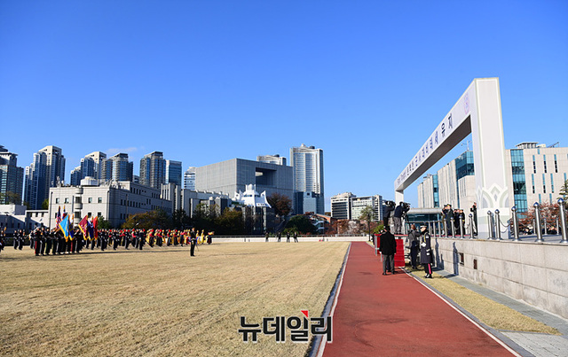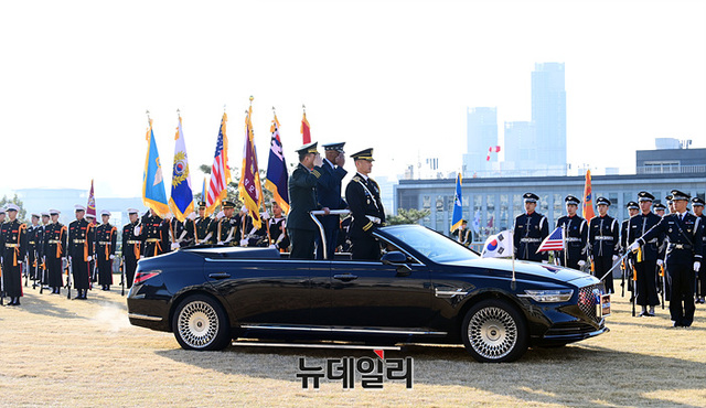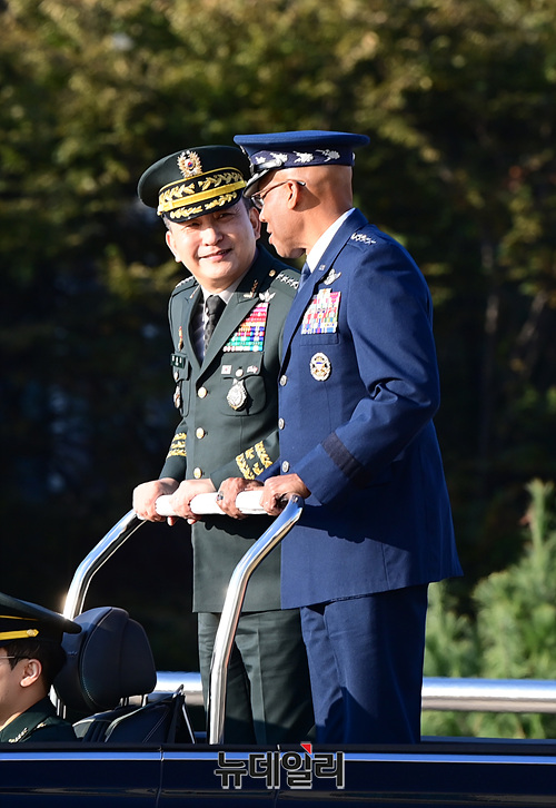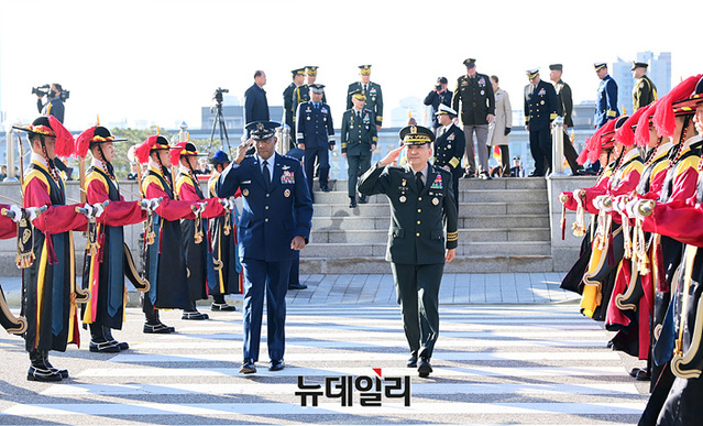 취임 후 첫 방한한 찰스 브라운 미 합참의장과 김승겸 합참의장이 12일 오전 서울 국방부에서 열린 환영식에서 사열하고 있다.