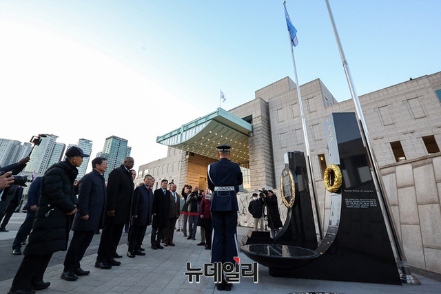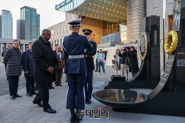 로이드 오스틴 미 국방장관이 12일 오후 서울 용산구 전쟁기념관 평화의광장에서 한국전쟁 참전 미군 추모비에 헌화를 마친 후 한미재향군인들과 대화하고 있다. (사진=공동취재단)