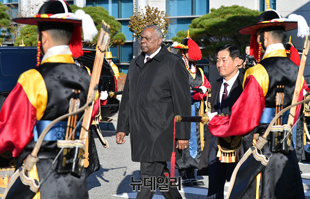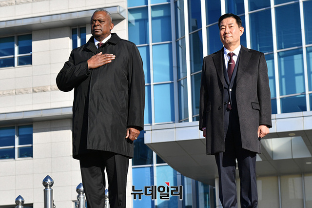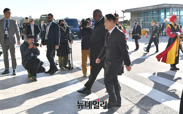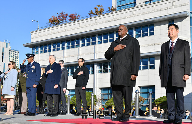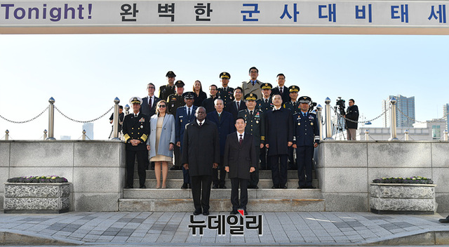 로이드 오스틴 미 국방장관과 신원식 국방장관이 13일 오전 서울 국방부에서 열린 55차 SCM(한미안보협의회의) 의장행사에서 한미 관계자들과 기념촬영을 하고 있다. (사진=사진공동취재단)