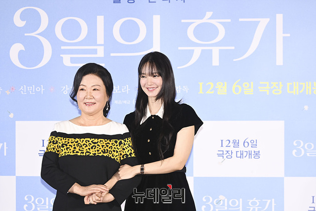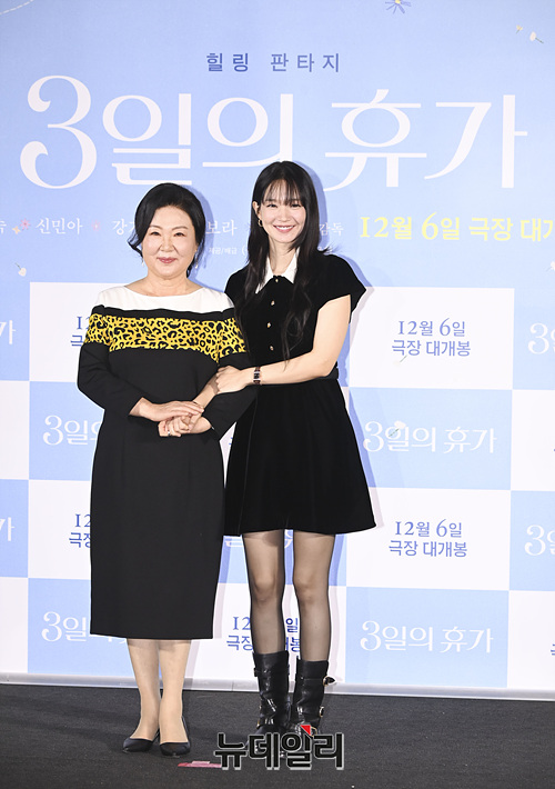 배우 김해숙과 신민아가 13일 오전 서울 용산구 CGV 용산아이파크몰에서 열린 영화 '3일의 휴가(감독 육상효)' 제작보고회에서 포즈를 취하고 있다.