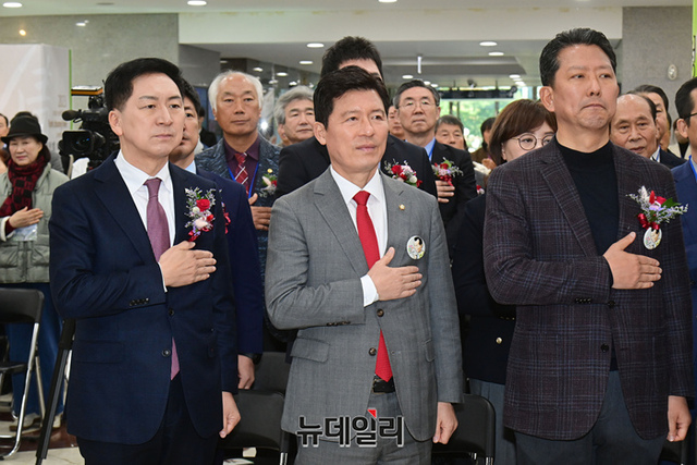 [포토] 박정희 대통령 사진전서 국민의례하는 김기현 대표