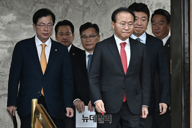 윤재옥 국민의힘 원내대표가 14일 오전 국회에서 열린 원내대책회의에서 참석하기 위해 입장하고 있다.