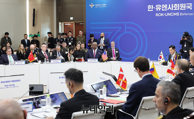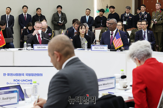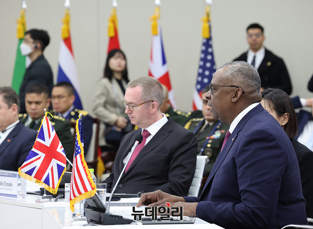 로이드 오스틴 미국 국방장관이 14일 오전 서울 용산구 국방부에서 열린 '한-유엔사회원국 국방장관회의'에서 기조연설을 하고 있다. (사진=공동취재단)