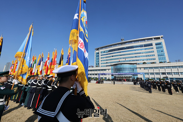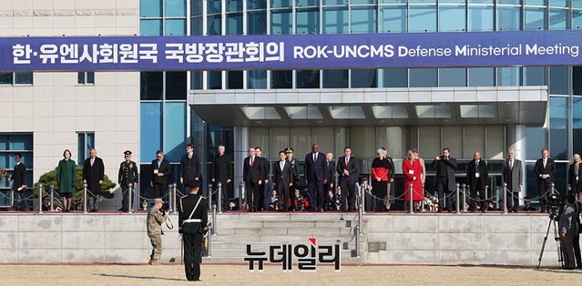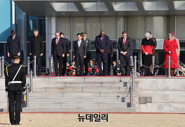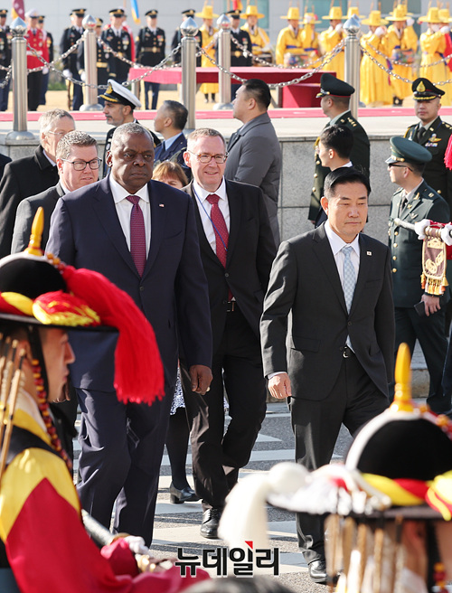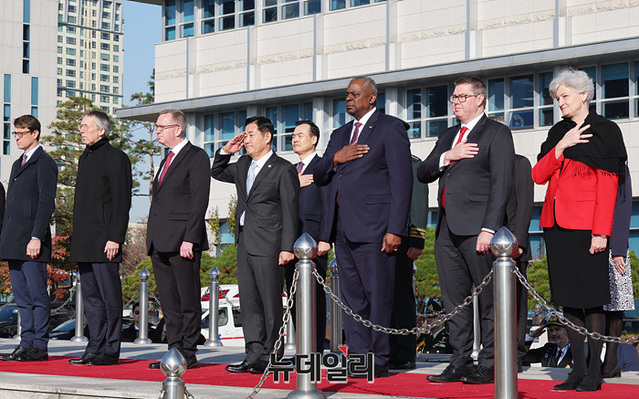 로이드 오스틴 미 국방장관과 신원식 국방장관이 14일 오전 서울 용산구 국방부에서 열린 '한-유엔사회원국 국방장관회의' 의장행사에 참석하고 있다. (사진=공동취재단)