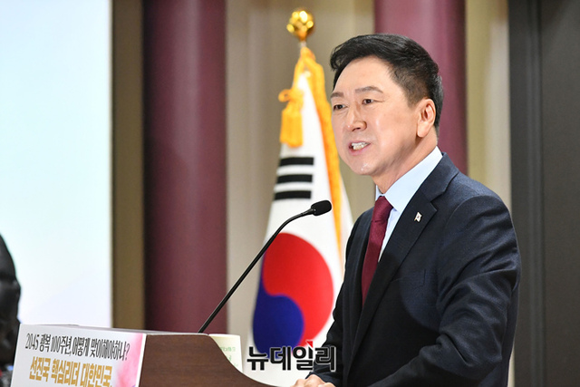 김기현 국민의힘 대표가 15일 오전 국회 의원회관에서 열린 '광복 100주년의 꿈, G3 대한민국으로 가는 길' 세미나에서 축사를 하고 있다.
