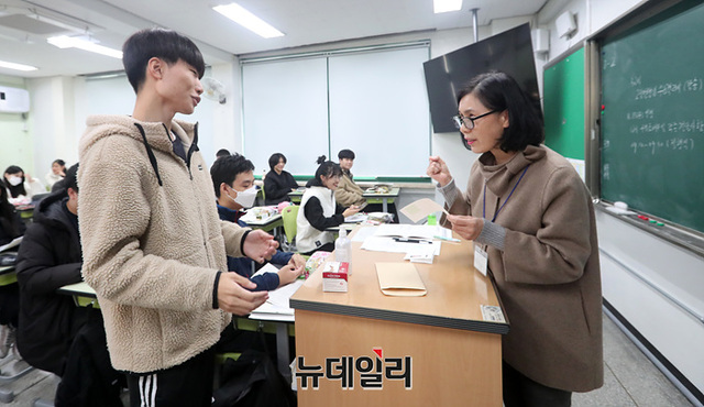 2024년 대학수학능력시험을 하루 앞둔 15일 오전 서울 광진구 광남고등학교에서 수험생들이 수험표를 받고 있다. (사진=공동취재단)