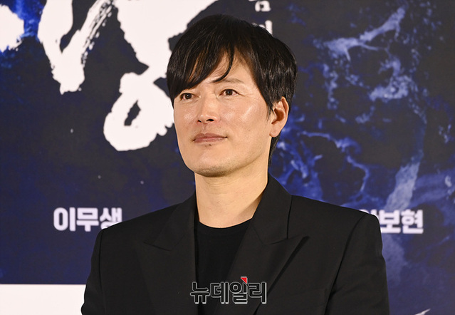 배우 정재영이 15일 오전 서울 광진구 롯데시네마 건대입구에서 열린 영화 '노량: 죽음의 바다(감독 김한민)' 제작보고회에서 포즈를 취하고 있다.
