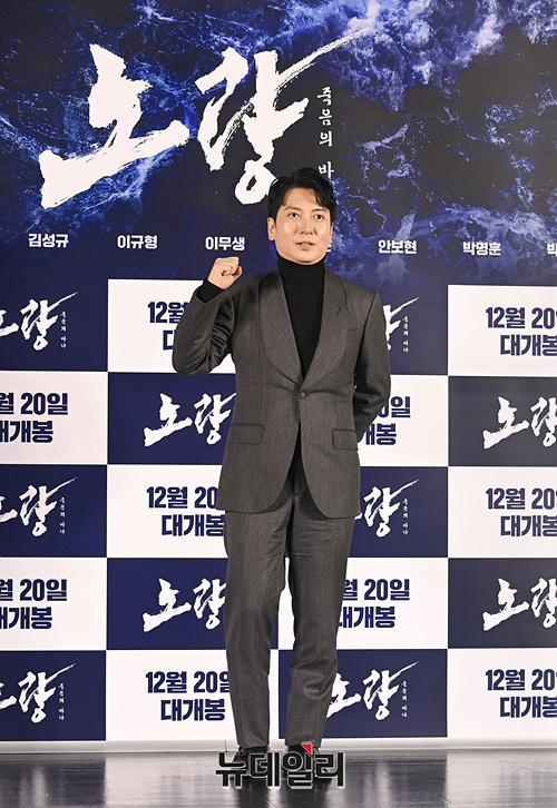 배우 박명훈이 15일 오전 서울 광진구 롯데시네마 건대입구에서 열린 영화 '노량: 죽음의 바다(감독 김한민)' 제작보고회에서 포즈를 취하고 있다.