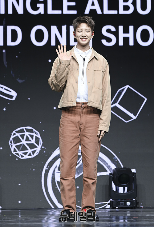 보이그룹 '엠퍼샌드원(AMPERS&ONE)' 카이렐이 15일 오후 서울 용산구 블루스퀘어 마스터카드홀에서 열린 데뷔 쇼케이스에서 포즈를 취하고 있다.