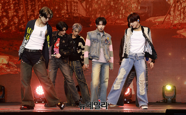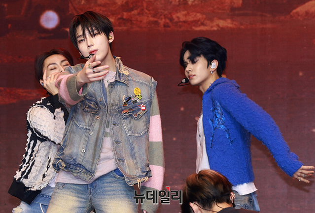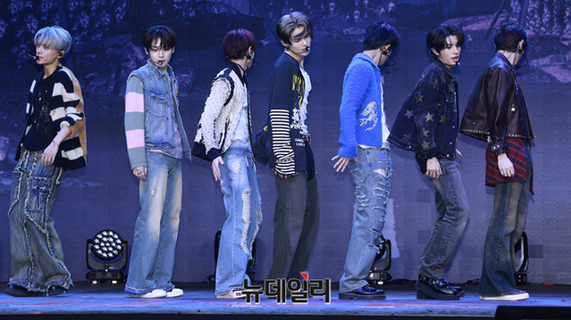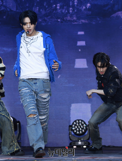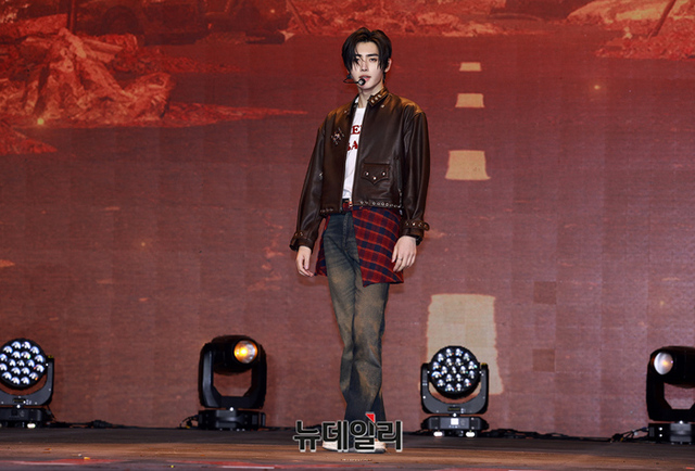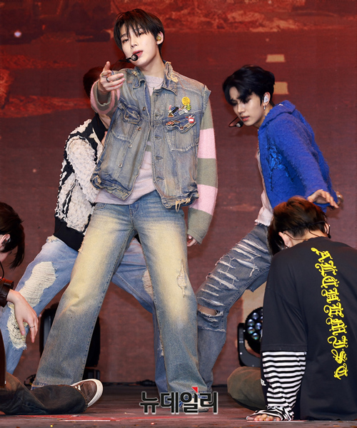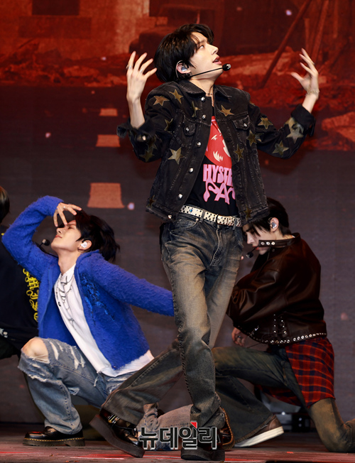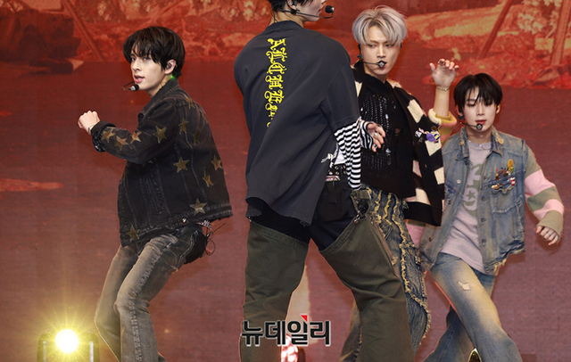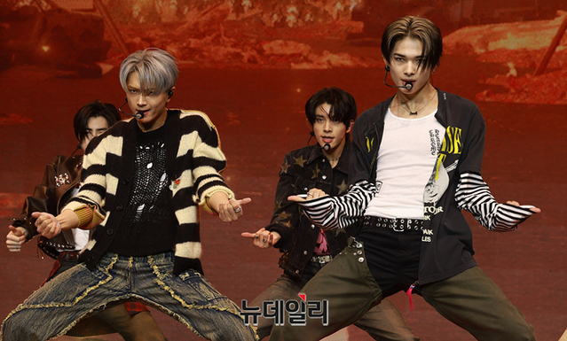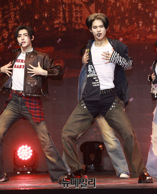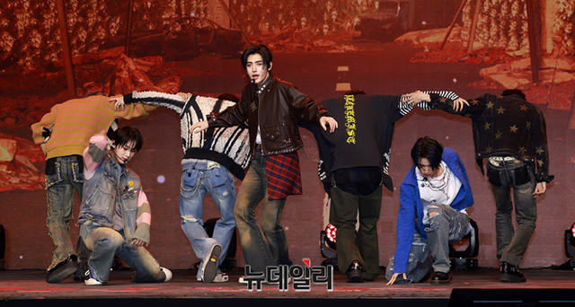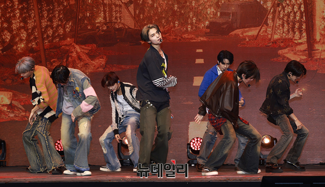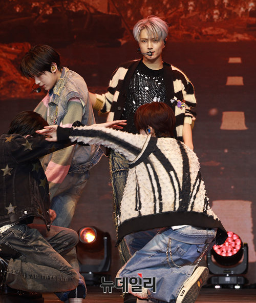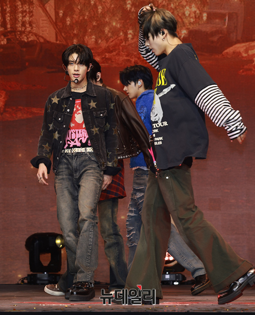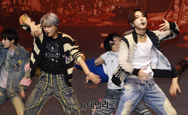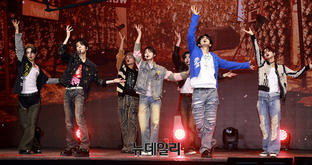 엔하이픈(ENHYPEN)이 16일 오후 서울 광진구 예스24 라이브홀에서 열린 5번째 미니앨범 쇼케이스에서 커플링곡 스틸몬스터 무대를 선보이고 있다.