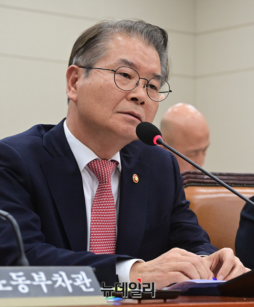이정식 고용노동부 장관이 16일 오후 국회에서 열린 환경노동위원회 전체회의에서 의원들의 질문에 답하고 있다.