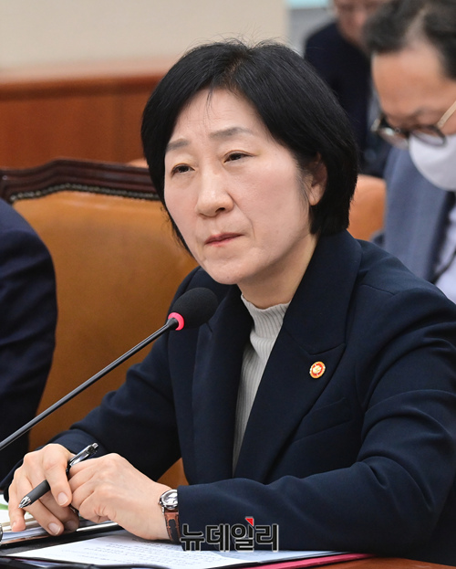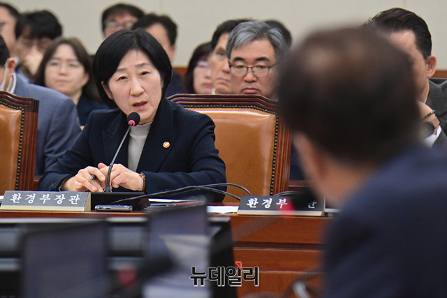 한화진 환경부 장관이 16일 오후 국회에서 열린 환경노동위원회 전체회의에서 의원들의 질문에 답하고 있다.