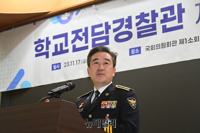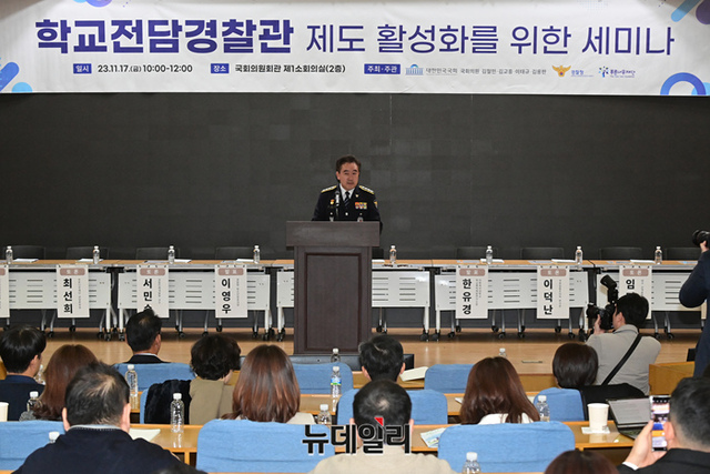 윤희근 경찰청장이 17일 국회 의원회관에서 열린 '학교전담경찰관 제도 활성화를 위한 세미나'에서 축사를 하고 있다.