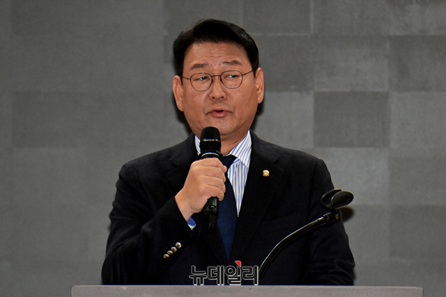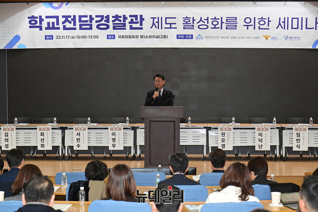 김교홍 더불어민주당 의원이 17일 국회 의원회관에서 열린 '학교전담경찰관 제도 활성화를 위한 세미나'에서 축사를 하고 있다.