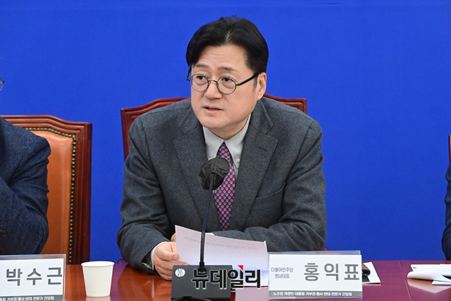 홍익표 더불어민주당 원내대표가 20일 국회에서 열린 노조법 2. 3조 개정안 대통령 거부권 행사 반대 전문가 간담회에서 모두발언을 하고 있다.