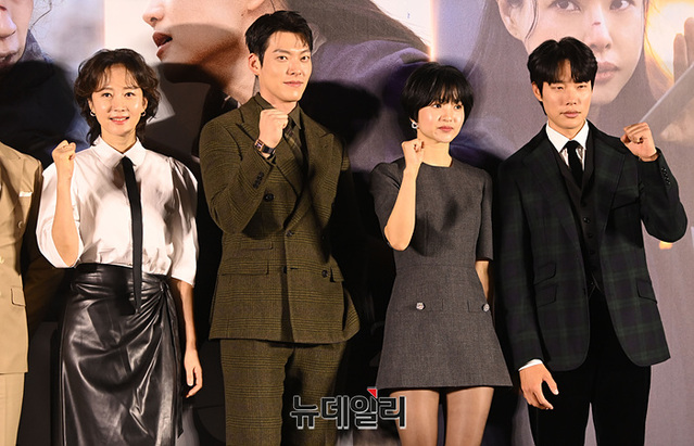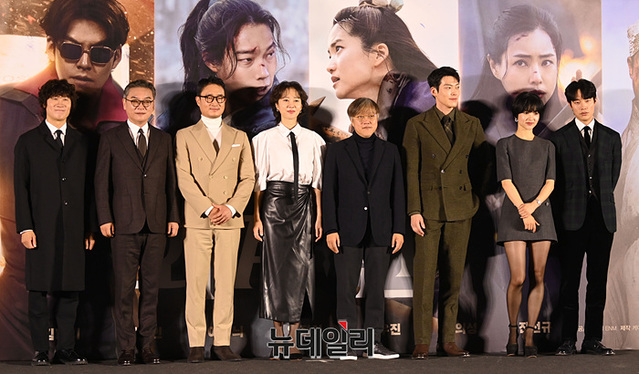 배우 진선규, 김의성, 조우진, 염정아, 김우빈, 김태리, 류준열, 최동훈 감독이 22일 오전 서울 CGV 용산아이파크몰에서 열린 영화 '외계+인 2(감독 최동훈)' 제작보고회에서 포즈를 취하고 있다.
