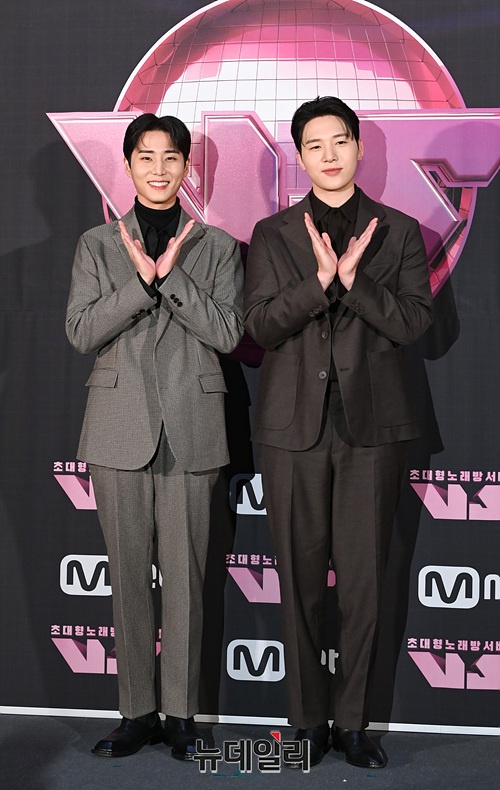 가수 영케이와 김민석이 22일 오후 서울 CGV 청담시네시티에서 열린 엠넷 예능 '브이에스(VS)' 신곡 음원 쇼케이스에서 포즈를 취하고 있다.
