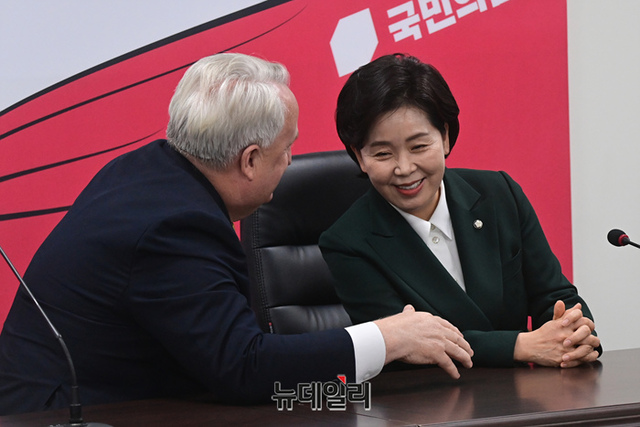 인요한 국민의힘 혁신위원장과 양향자 한국의희망 대표가 21일 오후 서울 여의도 국민의힘 중앙당사에서 열린 혁신위원회 10차 회의에서 대화를 나누고 있다.