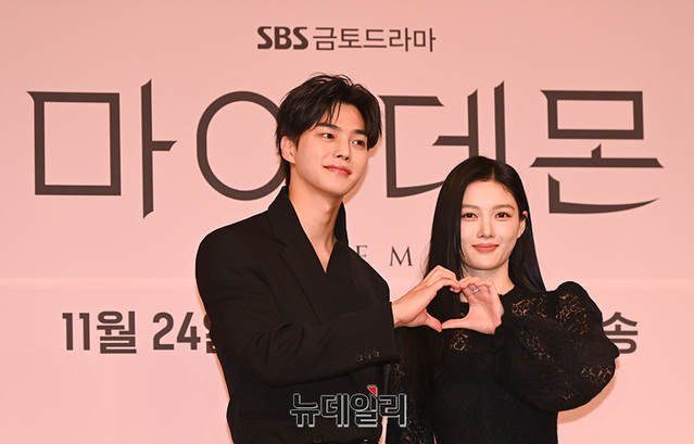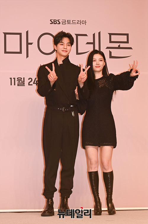 배우 송강과 김유정이 24일 오후 서울 목동 SBS 방송센터에서 열린 드라마 '마이 데몬(연출 김장한, 권다솜)' 제작발표회에서 포즈를 취하고 있다.