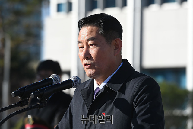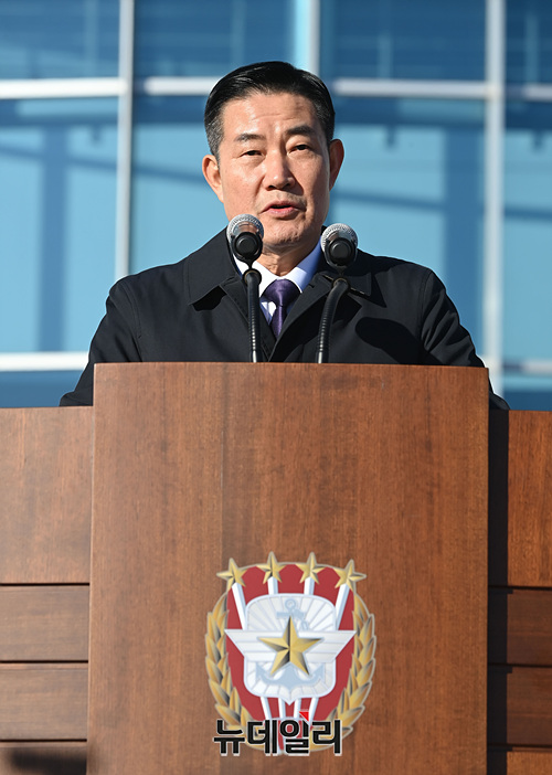 신원식 국방부 장관이 25일 오후 서울 국방부 연병장에서 열린 제 43대·44대 합참의장 이취임식에서 훈시를 하고 있다.