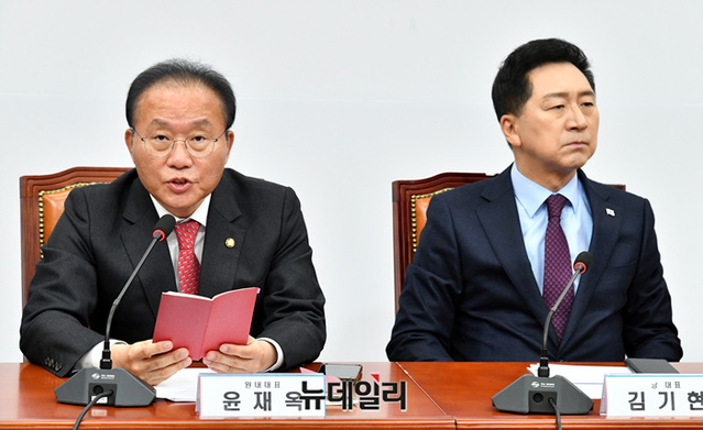 윤재옥 국민의힘 원내대표가 27일 오전 국회에서 열린 최고위원회의에서 모두발언을 하고 있다.