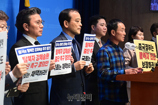 '2600명 탈북민 강제북송반대 범국민연합' 회원들과 지성호 국민의힘 의원이 27일 오후 국회 소통관에서 '탈북자 강제송환 중단 촉구 결의안' 국회 통과 촉구를 위한 기자회견을 갖고 있다.