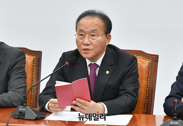 윤재옥 국민의힘 원내대표가 28일 국회에서 열린 원내대책회의에서 모두발언을 하고 있다.