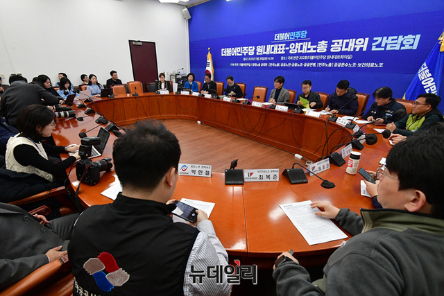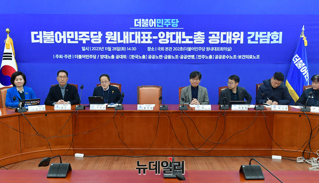 '더불어민주당·양대노총 공대위' 간담회가 28일 오후 국회에서 열리고 있다.