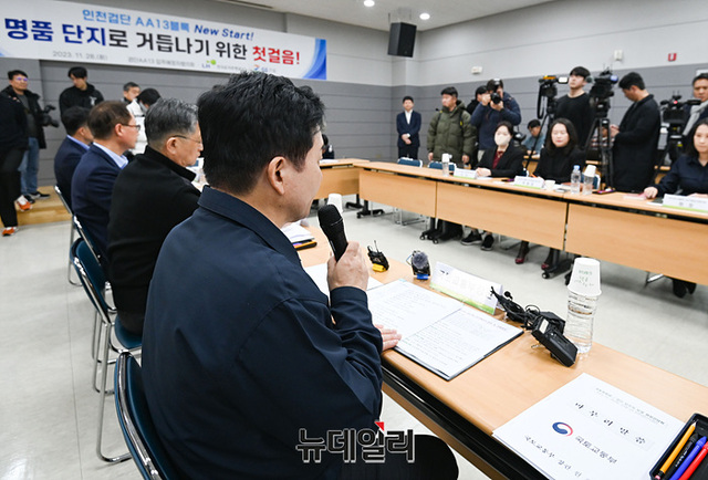 원희룡 국토교통부 장관이 28일 오후 인천 서구 LH 검단사업단에서 열린 '검단AA13 입주예정자 현장간담회'에서 인사말을 하고 있다.