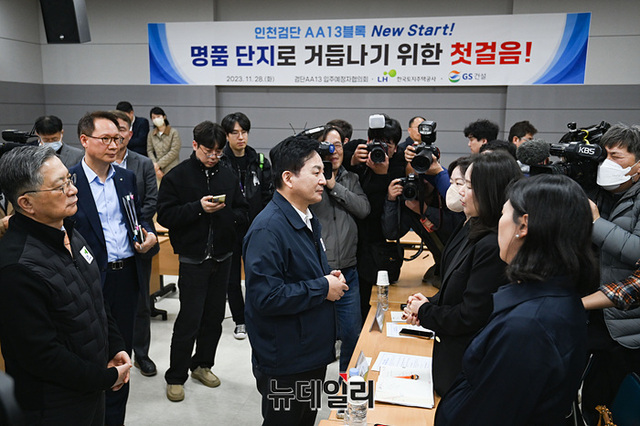 이날 간담회에는 원희룡 국토부 장관, 이한준 LH 사장, 허윤홍 GS건설 사장, 입주자 대표 등이 참석해 '인천검단 AA13블록 보상 기본방향에 대한 합의서'에 서명했다. (인천=서성진 기자)
