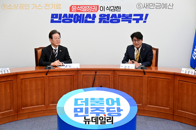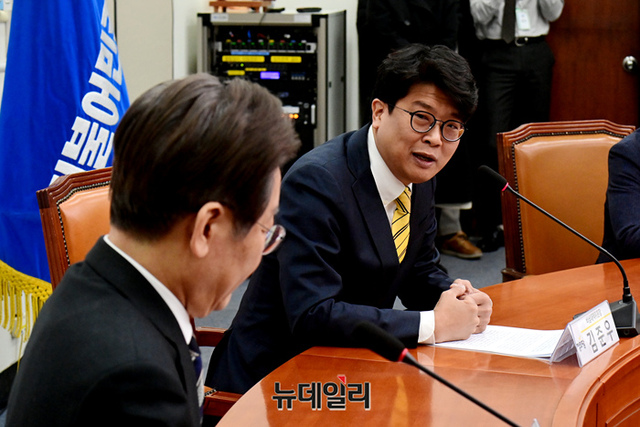이재명 더불어민주당 대표와 김준우 정의당 비상대책위원장이 29일 국회에서 만나 환담을 나누고 있다.