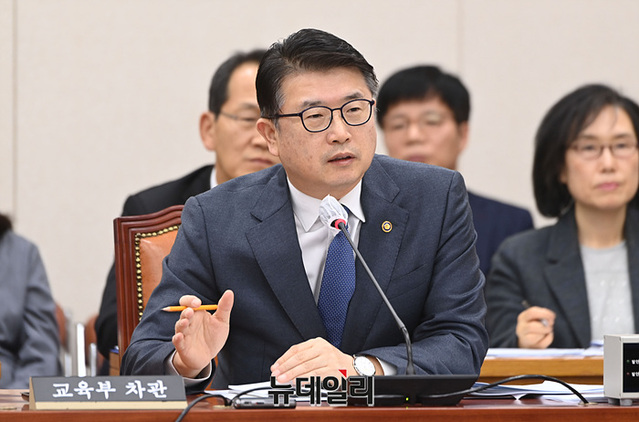 장상윤 교육부 차관이 29일 오후 국회에서 열린 교육위원회 전체회의에서 의원들의 질의에 답하고 있다.